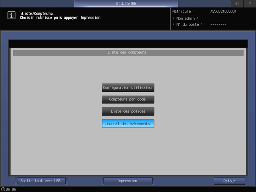 Sélectionnez [Journal des événements] et appuyez sur [Sortir tout vers USB].