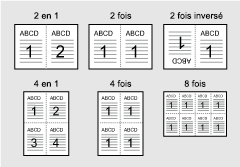 Vous pouvez combiner et imprimer 2 ou 4 pages sur une seule feuille. Vous pouvez aussi imprimer 2 ou 4 copies de la même page sur une seule feuille. L'envers de la page peut être retourné lors de l'impression de 2 copies sur une page.