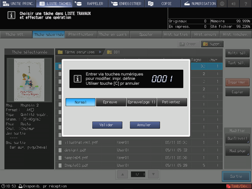 Pour en savoir plus sur les fonctions de modification des tâches de l'écran [LISTE TRAVAUX], comme l'enregistrement sur le disque dur, voir Modifier une tâche en attente.