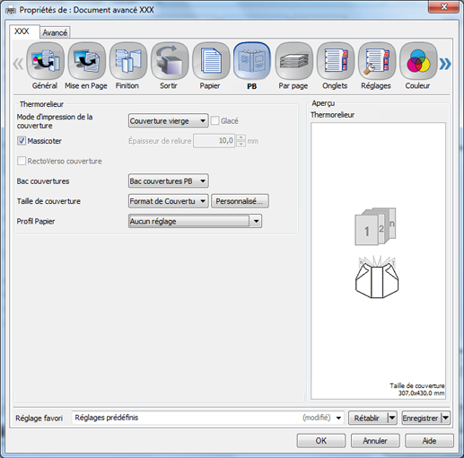 [Taille de couverture] | - | Définissez le format de couverture. Pour définir un format de couverture personnalisé, cliquez sur [Format personnalisé]. |