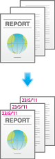 [Recto vers extérieur] | Non, Oui | Sélectionnez cette option pour imprimer la [Date/Heure] sur le bord extérieur des pages en regard. Cette fonction est disponible quand [Livret] ou [Reliure adhésive] est sélectionné sous l'onglet [Mise en Page]. | |
