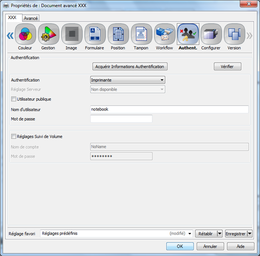 [Nom du compte] | - | Pour imprimer, entre le nom de compte si [Réglages Suivi de Volume] est activé. |