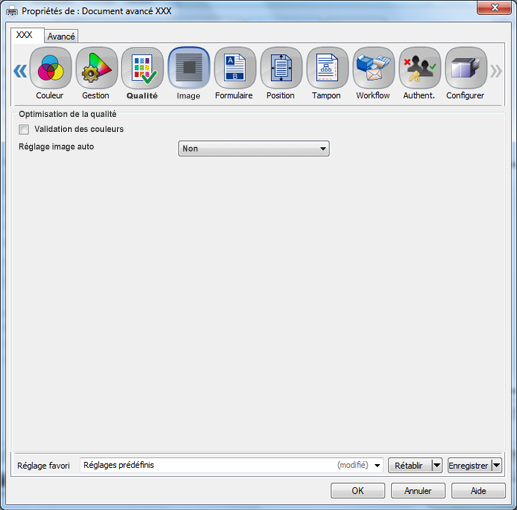 [Validation des couleurs] | Non, Oui | Indiquez si la fonction de validation des couleurs doit être utilisée à l'impression des données. |
