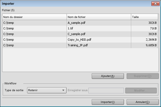 Les types de fichiers pouvant être importés sont PS, PDF, TIFF, TIF, JPEG, JPG, ZIP et PPML.