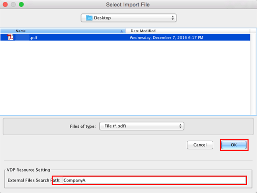 Par exemple, pour créer un sous-dossier appelé [CompanyA] sous le dossier [pdfv]t et ensuite importer des fichiers, spécifiez [CompanyA] dans le chemin de recherche des fichiers externes.
