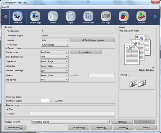 Onglet (icône) | Les éléments de réglage d'impression sont répartis en plusieurs écrans de réglage. La sélection de l'onglet (icône) dans la partie supérieure de l'écran affiche l'écran de réglage correspondant au bas de l'écran. Les types d'écran de réglage sont les suivants :
