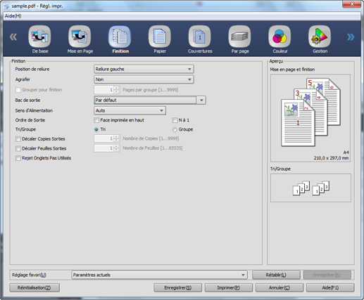 Les éléments de configuration sont ici les mêmes que ceux de l'onglet [Finition] du pilote Plug-in PS. Pour des détails sur les éléments de configuration commune, voir Finition.
