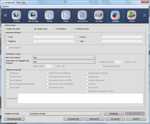 [DocumentID ] | Affiché uniquement lorsque PDL de la tâche sélectionnée est réglé sur PDF ou PDF (APPE). Pour imprimer [DocumentID] pour le fichier PDF, effectuez une sélection autre que [Non] pour [Information sur Réglages des Couleurs] et cochez ce paramètre. |