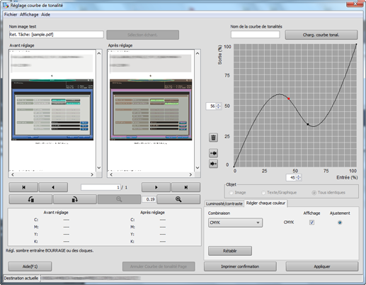 Vous pouvez régler la courbe de tonalité des tâches en attente individuellement. Cette fonction est utile pour réimprimer la tâche après le réglage de la courbe de tonalité uniquement. Vous pouvez également régler les courbes de tonalité de chaque page (Courbe de tonalité Page).