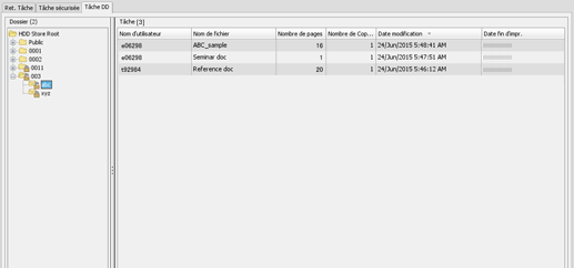 [Date fin d'impr.] | Affiche la date de fin d'impression de la tâche disque dur. Les tâches archivées sur le disque dur sont affichées comme "Non imprimées". Les tâches qui ne peuvent être modifiées que sur l'écran tactile de la machine sont affichées vierges. |