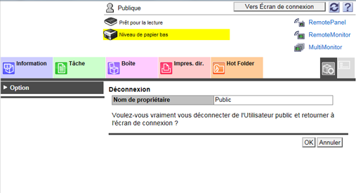 Message [Voulez-vous vraiment vous déconnecter de l'Utilisateur public et retourner à l'écran de connexion ?] s'affiche. Cliquez sur [OK].