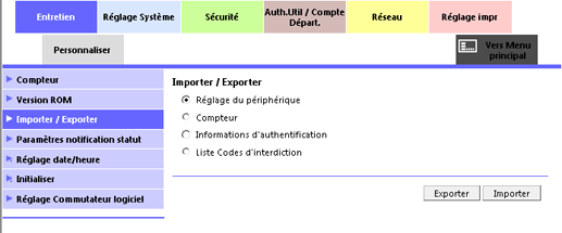 Pour afficher cet écran, cliquez sur [Importer / Exporter] dans le menu de l'onglet [Entretien].