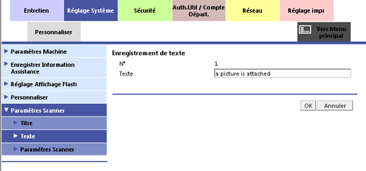 Pour afficher cet écran, cliquez sur [Paramètres Scanner] - [Texte] dans le menu de l'onglet [Configuration système].