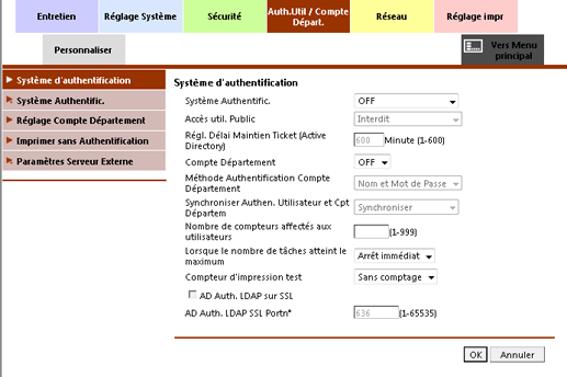 L'onglet [Auth.Util / Compte Départ.] propose les réglages concernant les fonctions d'authentification de la machine.