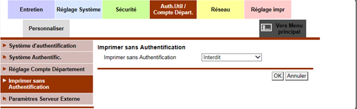 Pour afficher cette page, cliquez sur [Imprimer sans Authentification] dans le menu de l'onglet [Auth.Util / Compte Départ.].