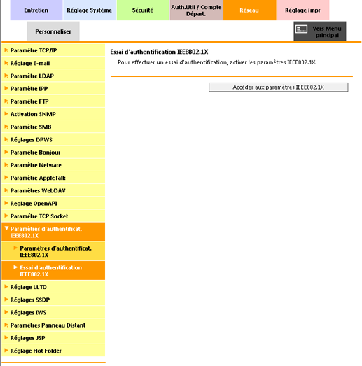 Si vous sélectionnez [OFF] sous [Paramètres d'authentificat. IEEE802.1X], vous ne pouvez pas effectuer l'essai d'authentification IEEE802.1X. Cliquez sur [Paramètres d'authentificat. IEEE802.1X] pour basculer le réglage sur [Oui].