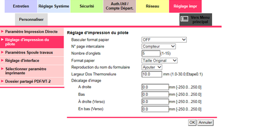 Cliquez sur [Réglage d'impression du pilote] dans le menu de l'onglet [Réglage impr] pour afficher cet écran.