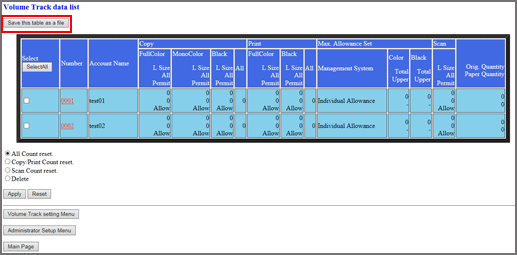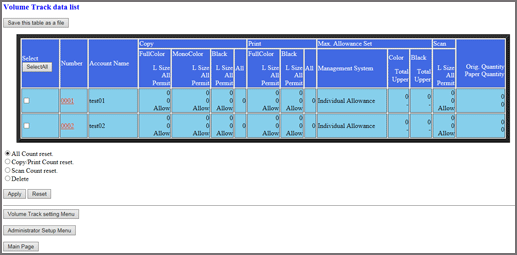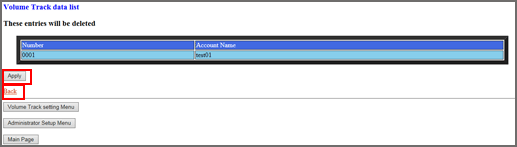 Cliquez sur les cases de l'écran [Volume Track data list] pour sélectionner les données de compte département à supprimer. Cliquez sur la case d'option [Delete].