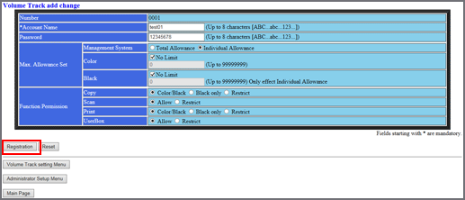 Modifiez [Account Name], [Password], [Max. Allowance Set] et [Function Permission]. Vous pouvez modifier ces données de la même manière que pour les enregistrer. Pour en savoir plus, voir Enregistrement des données d'un nouveau compte département sur le navigateur.