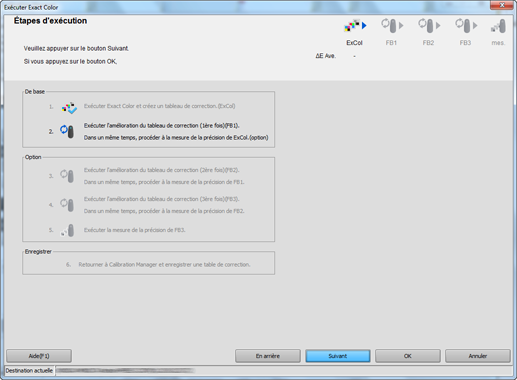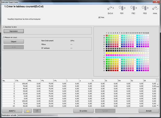 L'écran pour exécuter l'étalonnage avec Exact Color s'affiche. "FB" signifie "retour" et "FB1" désigne le premier retour.