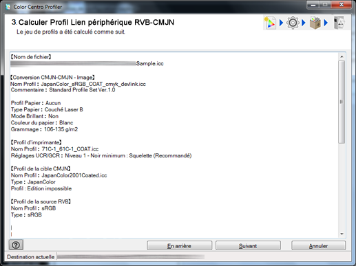 L'écran Résultat du calcul affiche la liste des réglages du profil du lien périphériques RVB-CMJN généré.