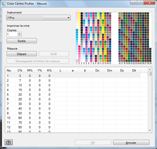 Les trames de mires et les formats papier disponibles varient en fonction du type de colorimètre.