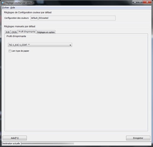 [Configuration des couleurs] | Affiche la configuration couleur par défaut du contrôleur d'image. Pour en savoir plus, voir Gestion de configuration couleur. | |