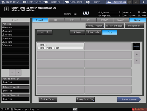 La liste des adresses e-mail est affichée par défaut. Pour en savoir plus sur l'onglet Destination par défaut de l'écran [NUMERISER], voir Configuration scanner : définition des valeurs par défaut des fonctions de numérisation.