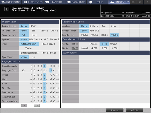 Réglages disponibles : Présentation, Réglage qualité, Format numérisation, Couleur/Résolution, Taux de restitution, Application