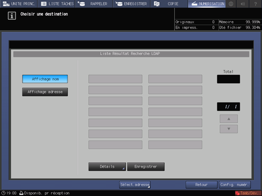 • Sur l'écran [Enregistrement des résultats de recherche LDAP], vérifiez les champs [Adresse], [Nom de registre] et [Nom recherche] et si tout va bien, appuyez sur [Valider] pour enregistrer l'adresse.
