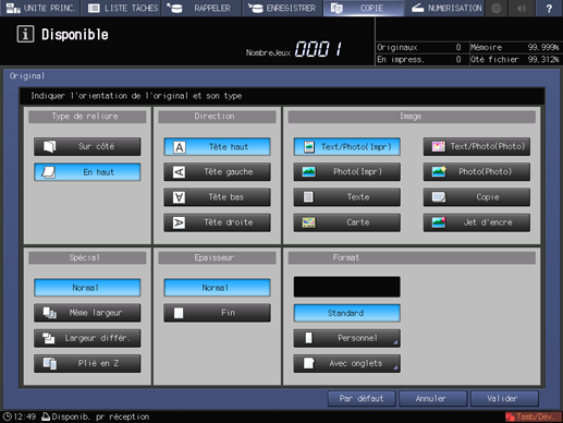 Pour copier des originaux recto-verso reliés en haut (imprimés tête en bas sur pages verso), sélectionnez [En haut] comme [Type de reliure] dans [Original]. Pour copier des originaux recto-verso reliés latéralement (même bord en haut de page), sélectionnez [Sur côté].