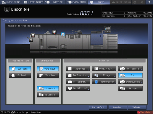Sur le [Type de reliure] dans [Réglage sortie], voir Définition du sens de reliure des copies recto-verso.