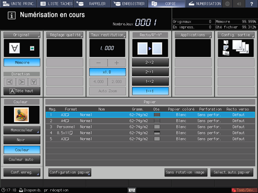 En mode [Mémoire], le nombre de feuilles par tâches n'est pas limité. Il dépend de l'espace libre sur le disque dur. La machine peut numériser environ 10.000 feuilles de format A4.
