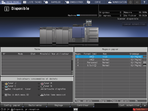 Vérifiez le réglage papier de chaque magasin affiché sous [Papier].