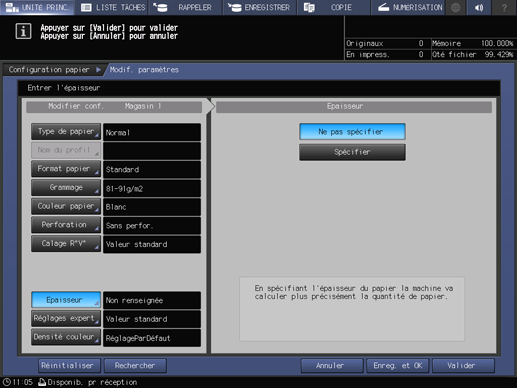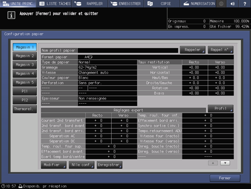 [Réglages expert] n'est pas affiché dans la configuration par défaut. Pour effectuer les réglages expert du [Réglage papier] proposé sur l'écran [MACHINE] ou sur l'écran [COPIER] , contactez le technicien SAV.