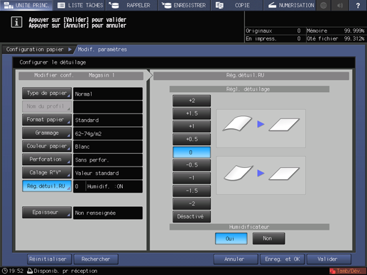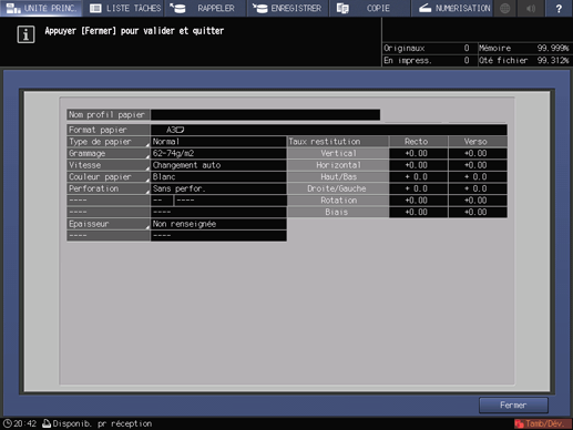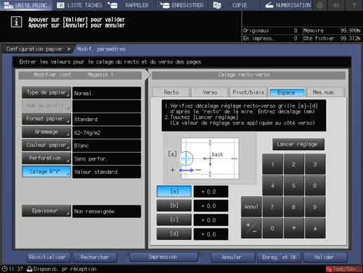Si vous modifiez les réglages de [Taux restitution] de [Recto] ou [Verso], [Décalage de l'image], [Pivot/biais] et [Mire réglage] ou si vous effectuez le réglage [Espace] ou [Mes.num.], l'indication de [Calage R°V°] sur l'écran [Modif. paramètres] devient [Valeur modifiée].