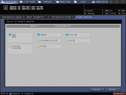 Les formats détectables varient en fonction de la sélection [Oui ou [Non] pour l'utilisation du [Format K] dans le réglage administrateur de l'écran Menu Utilitaires. Pour en savoir plus, voir Format K : sélection ou non du papier de format K.
