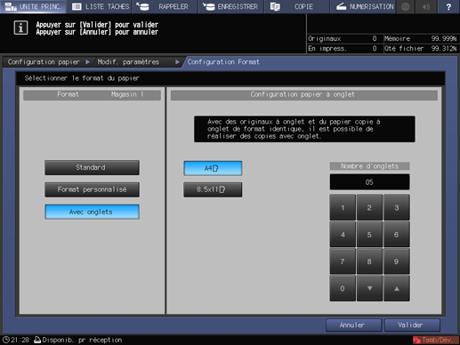 La sélection [Avec onglets] affiche l'écran [Réglage papier à onglet].