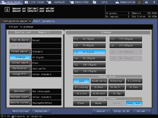 L'écran [Grammage] s'affiche. Sélectionnez une touche de grammage sous [Grammage].