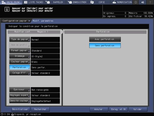 Pour charger des feuilles perforées, sélectionnez [Avec perforation et pour charger des feuilles sans perforation, sélectionnez [Sans perforation].