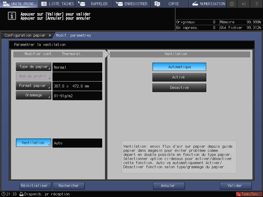 Si vous sélectionnez le magasin [Thermorel.] du thermorelieur PB-503 à l'étape 5 et que vous appuyez sur [Ventilation], l'écran [Ventilation] suivant s'affiche.