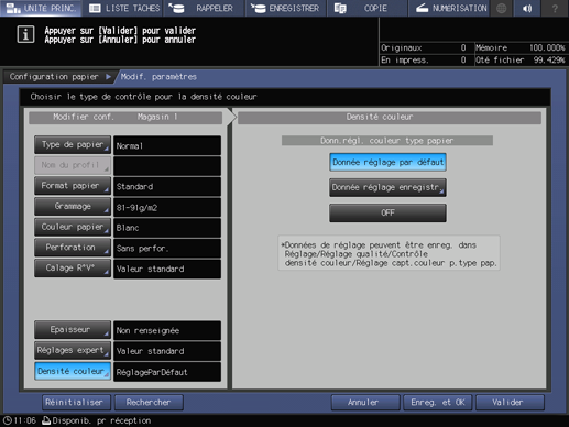 Ce réglage est activé en sélectionnant [Activé] pour [Contrôle densité couleur] accessible dans [Contrôle densité couleur] - [Paramètre fonctions de base] sur l'écran [Menu réglages].