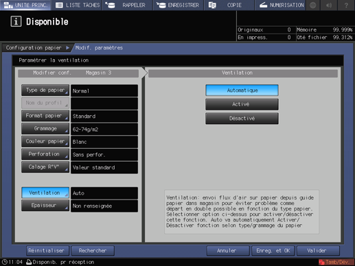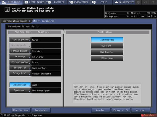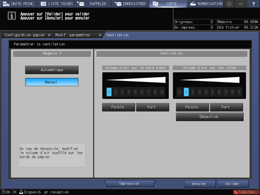 Si vous sélectionnez le [Magasin 3] de l'unité grande capacité LU-202m ou de l'unité grande capacité LU-202XL à l'étape 5, puis que vous appuyez sur [Ventilation], l'écran de réglage [Ventilation] suivant s'affiche.