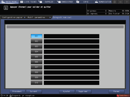 Pour changer le nom de couleur spécifié, appuyez sur [Saisie nom couleur] pour afficher l'écran [Saisie nom du papier coloré] et renommez-la.