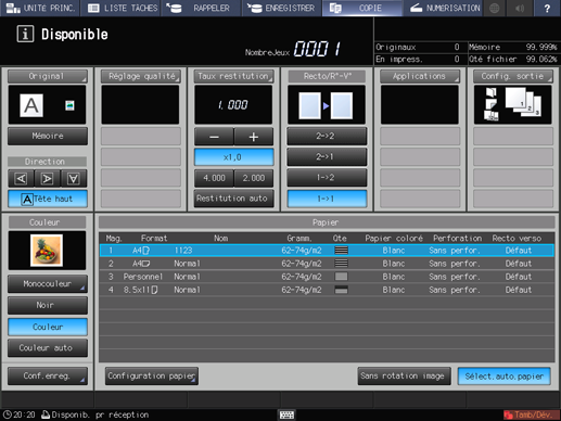 La fonction [Sélect.auto.papier] peut être inopérante en raison des spécifications papier du magasin, même si le papier chargé dans le magasin est au format sélectionné. Pour en savoir plus, voir Sélection papier auto : réglage des conditions papier pour le chargement auto magasin.