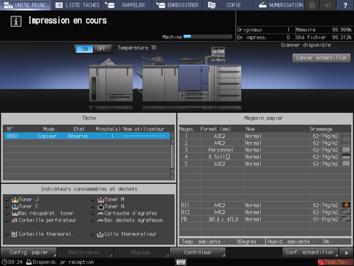 Répétez les étapes 1 et 2. Vous pouvez réserver jusqu’à 100 tâches y compris les tâches interrompues. Pour confirmer/contrôler les tâches en impression, affichez l'écran [Tâches réservées] en appuyant sur l'onglet [LISTE TRAVAUX] et sur [Tâche réservée].