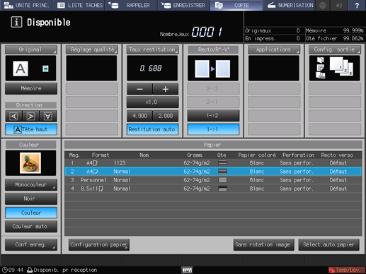 Lorsque vous sélectionnez [Enreg.sur HDD+impress°], [En attente + Imprimer] ou [Imprimer], [Disponible] est affiché dans la zone d'affichage des messages de l'écran [COPIER].