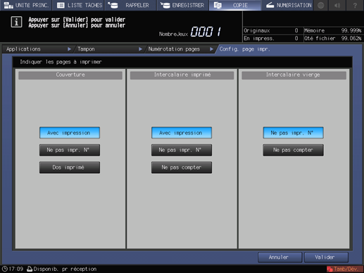 Sélectionnez une touche dans chacune des zones [Couverture], [Intercalaire imprimé] et [Intercalaire vierge].