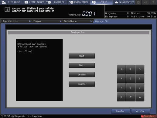 Effectuez les réglages fins de la position d'impression de [Numérotation des jeux], [Numérotation des pages], [Date/Heure] et [Annotation]. La plage de réglage est comprise entre 0 et 50 mm dans le sens de la longueur ([Haut] ou [Bas]) et dans le sens de la largeur ([Droite] ou [Gauche]).