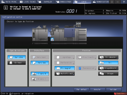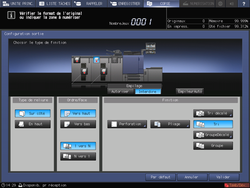 Lorsque l'empileur grande capacité LS-506 est monté, [Empilage] est affiché. Si deux unités de l'empileur grande capacité LS-506 sont montées, [Empileur Auto] est affiché. Pour en savoir plus, voir Commutation automatique d'empileur.